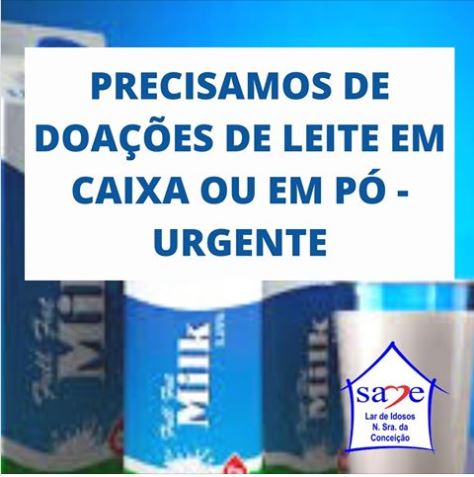 O SAME Lar de idosos, pede sua ajuda. Precisamos com urgência de doações de LEITE EM CAIXA OU EM PÓ. Na situação delicada que estamos vivendo, o consumo de leite aumentou de maneira significativa. Se você não pode ajudar agora, compartilhe esse pedido em suas redes sociais, para que possamos alcançar o maior número de pessoas possível. Somos gratos a todos que nos ajudarem, fiquem com Deus e obrigado.Rua Thales Ferraz, 261, Aracaju – Sergipe/ (79) 3215-5120. Conheça mais: https://www.facebook.com/samelardeidosos.se/