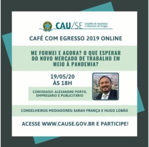 Urbanismo realiza amanhã, 19, o Café com Egresso 2019 Online, ao vivo, às 18h, direcionado aos novos arquitetos urbanistas de Sergipe, que colaram grau nas turmas do primeiro e segundo semestres do ano de 2019 (2019/01 e 2019/02), com objetivo de discutir perspectivas do atual mercado de trabalho, em meio à pandemia do novo coronavírus.