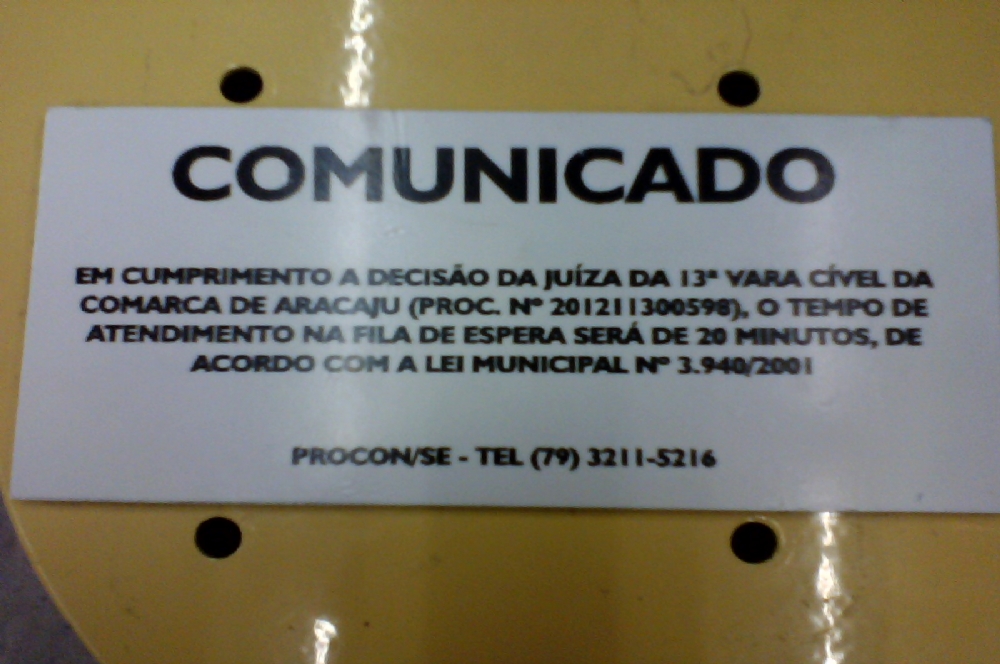 às leis do nosso Estado. O fato aconteceu ontem no Atacadão Mercantil Rodrigues. Eu e mais uma centena de pessoas vivenciamos uma verdadeira via-crucis nas filas do referido supermercado. Como sou curioso, prestei atenção em uma tarjeta que tinha colada em todos os caixas do supermercado (e olhe que não são poucos). Pois bem, a plaquinha em letras maiúsculas dizia: "EM CUMPRIMENTO À DECISÃO DA JUÍZA DA 13ª VARA CÍVEL DA COMARCA DE ARACAJU (PROC. Nº 201211300598), O TEMPO DE ATENDIMENTO NA FILA DE ESPERA SERÁ DE 20 MINUTOS, DE ACORDO COM A LEI MUNICIPAL Nº 3.940/2001. Quando li a placa fiquei revoltado, pois há mais de 40 minutos que eu aguardava na fila. Diante da minha indignação, perguntei a um funcionário que estava próximo se naquela bodega tinha gerente. O funcionário olhou pra mim e apontando para o lado falou: "O gerente da bodega é aquele que tá ali sentado". Então, fui até o cidadão apontado como "gerente", mas o mesmo não me deu a mínima, estava sentado em um computador, não sei fazendo o que, e ali permaneceu, com cara de paisagem. Fica a pergunta? Se o Mercantil Rodrigues fixou uma placa informando ao consumidor o prazo de espera e não cumpri, o mesmo estaria ferindo o Código de Defesa do Consumidor, não é isso? E o pior, quebrando a autoridade da Juíza da 13ª Vara Civel, que em sua decisão julga que 20 minutos são suficientes para um atendimento digno ao cidadão. Ahhh, já ia esquecendo…. Na mesma plaquinha tinha o número do PROCON/SE, número esse que ninguém atende (Procon, cadê vc, alô, alô..pipipipipi…Lamentável. Nosso Estado deveria voltar a se chamar Sergipe Del´Rey…. Segue ainda a foto pra vocês verificarem que a plaquinha é fato…”