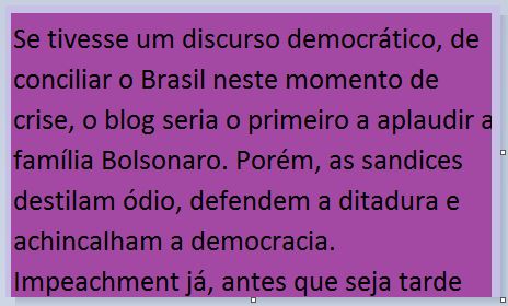 Se tivesse um discurso democrático, de conciliar o Brasil neste momento de crise, o blog seria o primeiro a aplaudir a família Bolsonaro. Porém, as sandices destilam ódio, defendem a ditadura e achincalham a democracia. Impeachment já, antes que seja tarde demais…
