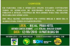 garantir as conquitas da Categoria e obter novas receitas de fontes de renda e novos filiados para os Sindicatos em Sergipe, agora no dia 12 de setembro do corrente ano, no Real Praia Hotel ,das 09:00hs as 17:00hs,estaremos realizando uma Grande Plenária das entidades Sindicais, para juntos discutirmos os novos caminhos do movimento sindical. Programação: 8h30, Coffeebreak; 9h, Abertura;9h30, Palestra _ João Domingos (Presidente da CSPB) ” Reforma da Previdencia MP 873 “/ Política de Alto Sustentabilidade Financeira e Análise da Conjuntura Política do Brasil”; 11h, Palestra _ Dr André Rodrigues (Presidente do Sindicato Online ) “Recuperação de Crédito do Servidor junto ao INSS “; 12h30, Almoço; 14h, Palestra Dr Daniel Santos ” Benefícios e Convênios para os Servidores”; 15h30, Debates e 16h30 ,Encerramento dos trabalhos. Coordenador do Evento Sergio Tavares e Apoiadores Raimundo Nonato e Fausto Andrade.