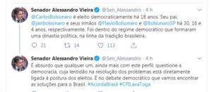 política Excelente texto do senador Alexandro Vieira pelo Twitter: “CarlosBolsonaro é eleito democraticamente há 18 anos. Seu pai, @jairbolsonaro e seus irmãos @FlavioBolsonaro e @BolsonaroSP há 30, 16 e 4 anos, respectivamente. Foi dentro do regime democrático que formaram uma dinastia política, na linha da tradição brasileira. É absurdo que qualquer um, ainda mais com este perfil, questione a democracia, cuja lentidão na resolução dos problemas está diretamente ligada à postura dos eleitos. É no debate democrático que vamos encontrar as soluções para o Brasil. #AcordaBrasil #CPILavaToga”