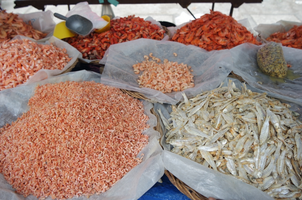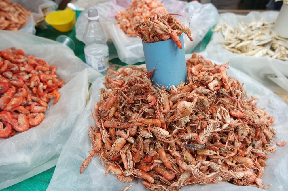Do lado direito do Centro de Abastecimento, chama atenção a quantidade de camarão e os tipos do crustáceo expostos, que vão desde aos camarões de viveiro, de água doce, com casca, filé de camarão, a saburica e os defumados.