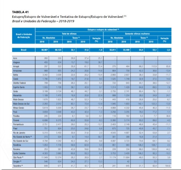 Além da justiça, a sociedade só recrimina o estupro quando este pode prejudicar a economia, ou seja, quando há pressão popular, boicotes que levem à perda de lucros, a exemplo de um time de futebol que contrata um estuprador devidamente condenado em outro país, o jogador Robinho, condenado em 2017 a 9 anos de prisão por crime sexual. Eu poderia escrever várias páginas para falar sobre isso, mas termino esse texto, deixando com vocês, as imagens do Anuário da Segurança Pública, ressaltando que, além desses dados, há ainda os inúmeros casos subnotificados, em que as mulheres têm medo de denunciar, ou quando acabam tirando as suas vidas por não aguentar mais a constante violação do seus agressores, e de uma sociedade conivente com a violência contra a mulher.