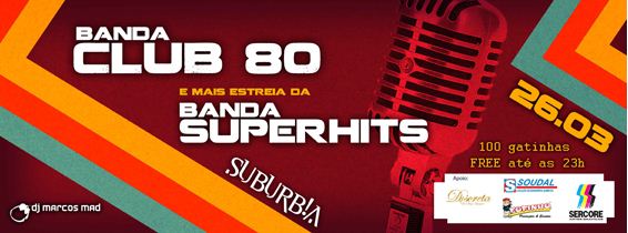 E sábado, 26, a partir das 22hs, um show para quem estava com saudades. Banda Club 80 e banda Superhits no Suburbia. As 100 primeiras mulheres entram de graça. A banda Club 80: Marquinhos Dias, vocal; Marcelle Cristine, vocal; Igor Pessoa, guitarra; Igor Hudson, baixo; James Freitas, teclado e Gustavo Furiba, bateria.