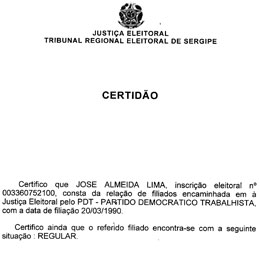Mas Almeida se filiou ao PSDB, assinou a ficha que foi abonada pela Mesmo ainda estando filiado ao PDT o senador Almeida Lima foi indicado vice-líder do PSDB no Senado. Até meados da tarde desta terça-feira as certidões emitidas pela justiça eleitoral continuavam acusando a permanência de Almeida no PDT. (ver cópia ao lado) Pode perder mandato Um advogado com experiência em legislação eleitoral informou hoje na Assembléia que se ficar comprovado que o senador Almeida Lima está exercendo a vice-liderança do PSDB estando ainda filiado ao PDT, ele poderá ser submetido à comissão de ética do Senado e pode até perder o mandato. Resta saber se alguém vai se pré dispor a formalizar a denúncia junto à Mesa do Senado! Não cita nome O deputado Ulices Andrade (PSDB) informou ontem que não tratará mais o senador Almeida Lima pelo nome. “Vou lhe dispensar o mesmo tratamento dado pela imprensa nacional”. Vai chamá-lo a partir de agora de Rolando Lero e de Darlene… Não deixou PDT O deputado estadual Garibaldi Mendonça, informou hoje continuar no PDT. “Só entro no PSDB depois que o senador Almeida Lima assumir o comando”, anunciou, sendo retrucado por Ulices Andrade (PSDB), “assim sendo o senhor não entrará no PSDB nunca”. Recadastramento O PPS dá inicio esta semana ao processo de recadastramento de seus filiados em todo o país. Sexta-feira última o partido esteve reunido para cobrar agilidade aos dirigentes dos 65 diretórios da legenda em Sergipe neste processo e também para preparar a reunião com o Secretário Geral, Rubens Bueno, que acontecerá nesta quinta-feira, dia 03, aqui em Aracaju. Albano governador O PSDB entregou documento ao ex-governador Albano Franco, sábado passado, cobrando sua candidatura ao Governo do Estado no próximo ano. “O PSDB terá candidato a governador e será Albano”, garantiu Ulices ao deixar claro que não haverá aliança com o PT do prefeito Marcelo Déda. -O PSDB não é aliado do PT, garantiu. José Araújo é jornalista