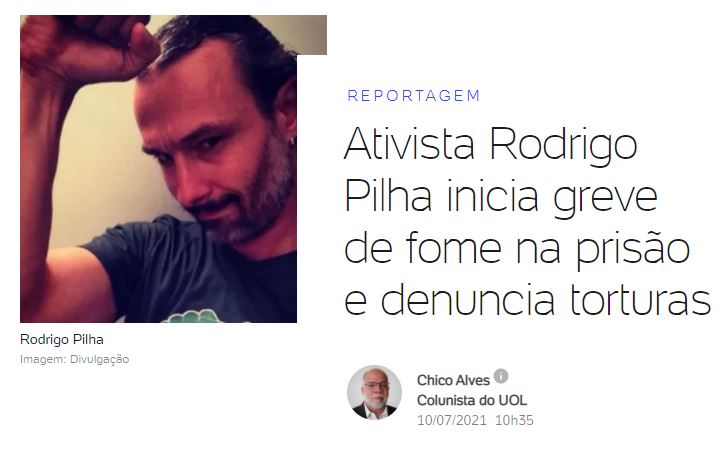 Coletivo Botando Pilha em campanha para denunciar a prisão arbitrária do ativista Rodrigo Pilha que iniciou Greve de Fome na noite da última sexta-feira, 09, denunciando prisão arbitrária mesmo com liberdade autorizada continua mantido como Preso Político. Conheça toda história aqui.