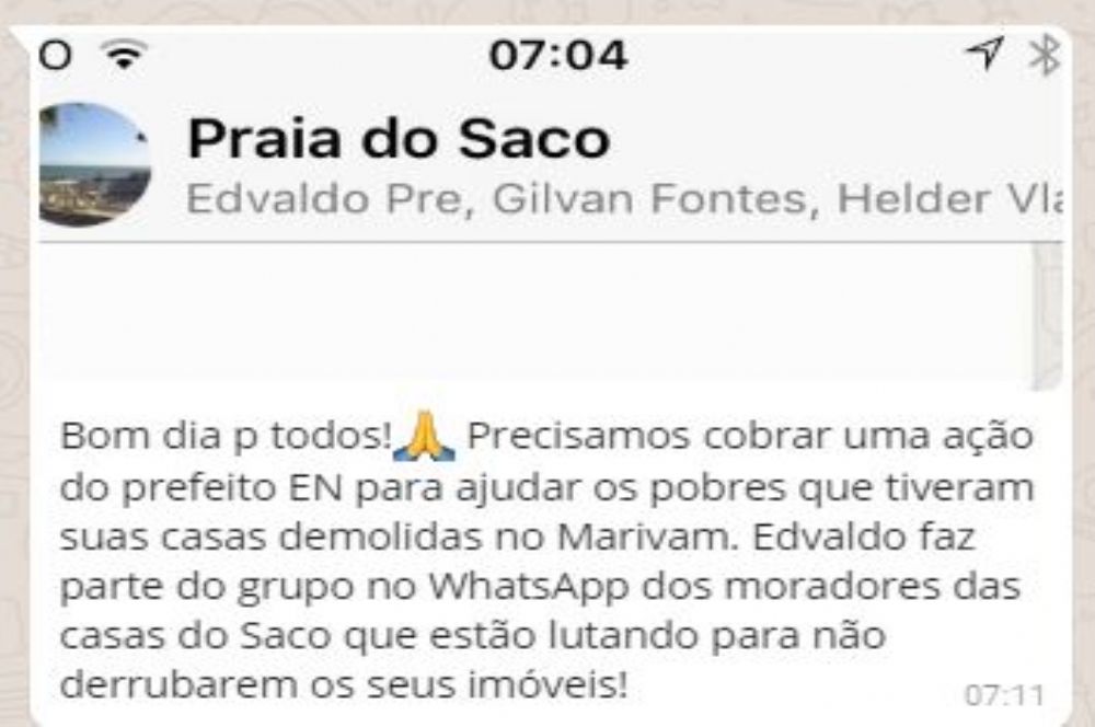 Lembrando que Edvaldo faz parte do grupo que luta para não derrubar casas da praia do Saco, Fontes pede ação dele para pobres do
