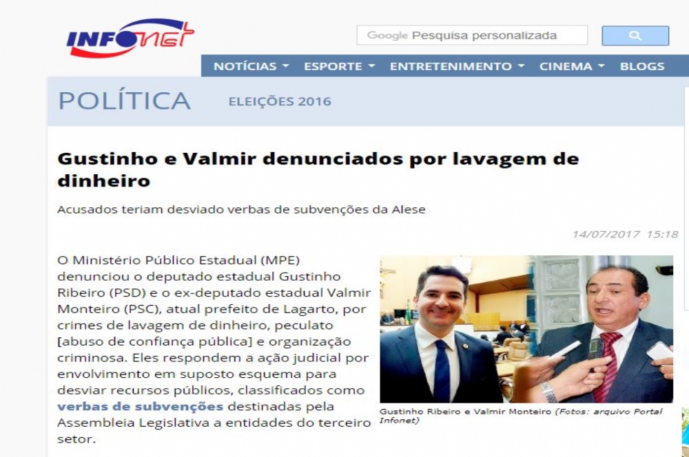 Lagarto: MPE denuncia deputado, prefeito e outros por formação de quadrilha, peculato e lavagem de dinheiro – O deputado estadual Gustinho Ribeiro, o prefeito de Lagarto, Valmir Monteiro e outras pessoas foram denunciados pelo Ministério Público Estadual no Judiciário pela prática de crime de peculato, formação de quadrilha e lavagem de dinheiro.