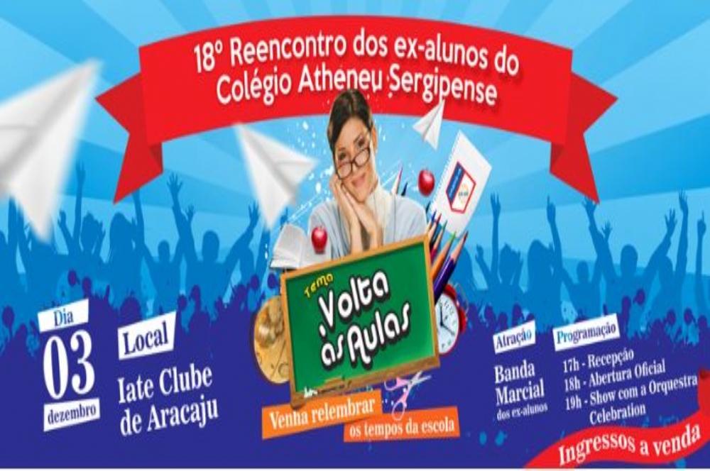Com o tema “Volta às Aulas”, a comissão organizadora de ex-alunos aguarda você para reviver os bons tempos de escola, em período eufórico de retorno às aulas. Tudo isso, ao som da orquestra Celebration (Maceió-AL) e do esperado desfile da Banda Marcial dos Ex-Alunos do Atheneu Sergipense.