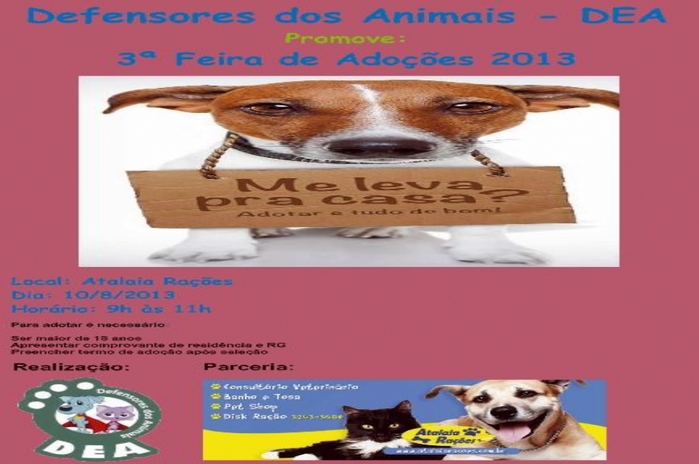 realizará a 3ª Feira de Adoções de 2013 de cães filhotes no Estabelecimento Atalaia Rações a partir das 9h.Para adotar é preciso: ser maior de 18 anos, levar comprovante de residência, identidade, passar por uma entrevista e assinar termo de adoção."