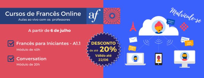 Aliança Francesa lança Cursos de Francês Online a partir de 6 de julho A partir de 6 de julho, a Aliança Francesa dará início ao Curso de Francês Intensivo, que é direcionado a alunos iniciantes, e ao Curso de Conversation, voltado para aqueles(as) que já estudaram e desejam aprimorar o idioma. Aproveite o período promocional com até 20% desconto para matrículas realizadas até o dia 22 de junho. As aulas são ministradas pelos professores através de uma plataforma interativa online e ao vivo. De 15 a 19 de junho, serão realizadas Aulas Experimentais de Francês. Faça francês no conforto de sua casa! Inscrições em http://www.afaju.com.br/matriculas/ ou através do e-mail secretaria@afaju.com.br ou do WhatsApp 98877 7904 | 98877 7905.