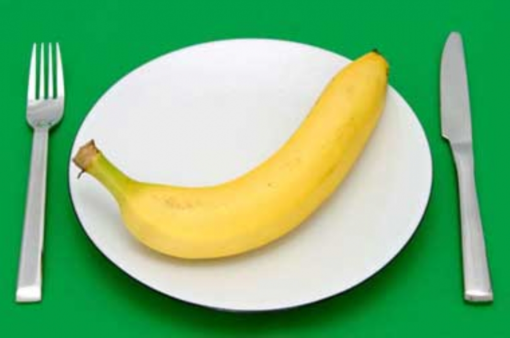 Come-se bem diferente do ambiente de sua casa ou como os primatas fazem, descascando em forma de flor. Para descascá-la, usam-se a faca na mão direita e garfo na mão esquerda. Espete a banana e faça um corte no sentido longitudinal para cortar a casca no sentido do cumprimento. Em seguida afaste a casca e use o garfo para cortar a fruta e trazê-la à boca à medida que for sendo cortada.