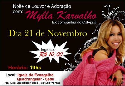 Noite de Louvor e Adoração com Mylla Karvalho. Será 21 de Novembro na Igreja do Evangelho Quadrangular (Sede) às 19h. O ingresso é apenas R$ 10,00. Venha adorar ao Senhor!