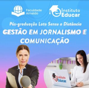 Pós a Distância: Gestão em Jornalismo e Comunicação. Início: 14/02/2022 APROVEITE O VALOR DE 1° LOTE… Você que busca um espaço no mercado como Gestor em Jornalismo e Comunicação, que tal adquirir competências nas áreas de gestão? Enriqueça seu currículo e conquiste seu espaço em empresas de comunicação privadas e públicas: faça o curso de Pós-graduação a Distância em Gestão em Jornalismo e Comunicação da Faculdade Arnaldo e viabilizado pelo Instituto Educar. Matrícula Grátis – 100% Online – Autorizado pelo MEC -Conclusão em 6 meses – Carga Horária: 360h. Investimento: 12X de R$ 75,00 (1º lote até 21/12/2021), 12X de R$ 100,00 (2º lote até 31/12/2021) ou 12X de R$ 125,00 (3º lote até 14/02/2022). Acesse https://institutoeducar.net.br/produto/pos-graduacao-em-gestao-em-jornalismo-e-comunicacao/ ou mande um Zap para (79) 98102 0909.