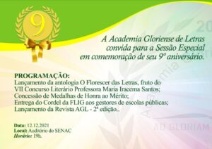 Legado e concessões de medalhas Essas ações grandiosas se unem à outras desenvolvidas individualmente por seus membros, seja na esfera local, seja na regional ou nacional. Assim a instituição acaba cumprindo com sua função, conforme preconiza o seu estatuto, honrando o legado do seu patrono-mor, Padre Léon Gregório. Para festejar o 9º aniversário, a AGL promoverá uma solenidade no auditório do SENAC, situado na Rua Manoel Francisco de Andrade, 100, Bairro Silos, Nossa Senhora da Glória, no dia 12/12/21, às 19h. Na ocasião, haverá a concessão de medalhas de honra ao mérito a cidadãos e cidadãs glorienses como reconhecimento por suas contribuições à educação, cultura e arte local. Haverá também a entrega do Cordel da FLIG aos gestores das escolas, o lançamento da antologia “O Florescer das Letras”, composta por textos dos finalistas do VII Concurso Literário Professora Maria Iracema Santos e haverá ainda o lançamento da segunda edição da Revista AGL, que agora adotará um perfil acadêmico e publicará anualmente ensaios, artigos, resenhas, entrevistas, além de textos literários em geral.