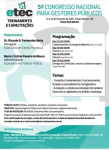 Capacitação O congresso que pretende capacitar os agentes públicos tem entre os temas debatidos a relação e a desburocratização dos poderes executivo e legislativo no âmbito municipal. Ricardo B. Fernandes Mota, advogado especialista em direito processual é um dos palestrantes. Já a administradora Maria Cristina Pereira de Moura discorrerá sobre políticas públicas. Mais informações: (79) 99859 – 8847 ou pelo e-mail: contato@etec-treinamento.com.br