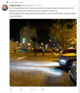 www.twitter.com/jorgearaujo55 O Policiamento que atua durante os jogos no Batistão “inovou” e resolveu proibir o acesso de veículos no estacionamento do lado das cadeiras, prejudicando torcedores que lá estacionam desde que existe o Batistão. Como desportista e em nome dos demais torcedores apelamos para que a PM analise e reveja esta medida que vem causando transtorno. Afinal aquela área representa estacionamento interno do Batistão, previsto desde a sua fundação.