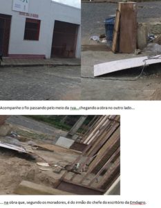 Atenção, diretoria da Emdagro! Escritório da empresa em Riachão fornecendo energia elétrica para obra privada As fotos ao lado foram enviadas por moradores do município de Riachão do Dantas revoltados com a administração da Emdagro no local. O leitor pode notar que um “puxadinho” da energia elétrica da sede do escritório da Emdagro para uma obra privada. E o pior: pelo que os moradores informaram a obra é do irmão do chefe do escritório em Riachão do Dantas. Pode isso? Com certeza a diretoria vai denunciar na delegacia e exonerar o chefe do escritório.