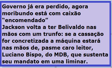 a máquina estará nas mãos de, pasme caro leitor, Luciano Bispo, do MDB, e que sustenta seu mandato em uma liminar. Ou seja, Jackson moverá uma palha em Brasília para ajudar o aliado a se manter no cargo? Quem aposta?