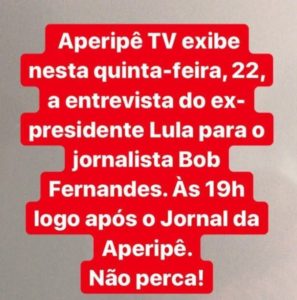 Sergipe Belivaldo Chagas (PSD), está utilizando a emissora educativa (TV APERIPÊ), para retransmissão da entrevista concedida por Lula ao jornalista Bob Fernandes. Detalhe: Lula está preso por ter sido condenado por corrupção passiva e lavagem de dinheiro. Sem julgar o mérito, usar a TV pública não é o melhor caminho. Essa programação não servirá muito para os que acessam o canal em busca de formação educativa?