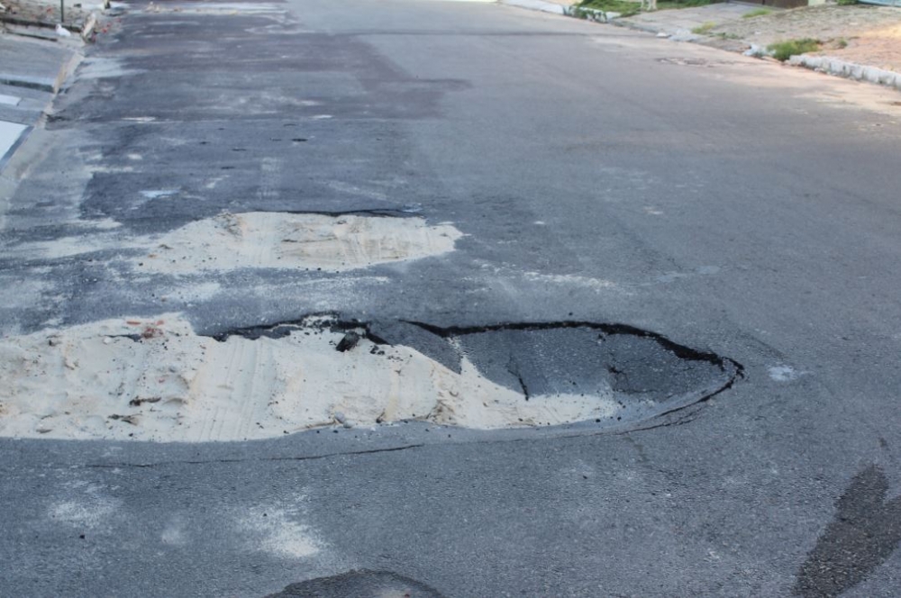 na Rua Guarapari, no Bairro Farolândia (fundo do Palácio de Veraneio) e deixou o trabalho inacabado. E o pior: depois que quebrou o asfalto tapou o buraco com areia. Como o leitor pode notar na foto ao lado o buraco a cada dia cede mais um pouco e já está tomando metade da rua. Se demorar mais um pouco algum veículo vai cair no buraco. É questão de tempo.