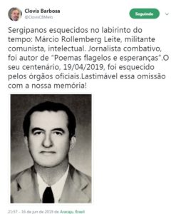 www.twitter.com/ClovisCBMelo Sergipanos esquecidos no labirinto do tempo: Márcio Rollemberg Leite, militante comunista, intelectual. Jornalista combativo, foi autor de “Poemas flagelos e esperanças”. O seu centenário, 19/04/2019, foi esquecido pelos órgãos oficiais. Lastimável essa omissão com a nossa memória!