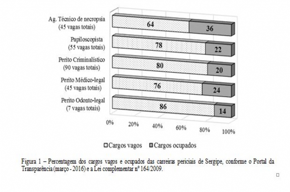 No caso dos Peritos Criminalísticos, formaram 50 Peritos Criminalísticos, em 2014, nas diversas áreas de conhecimento, destes o Estado nomeou apenas 10. Tal carreira exige 40 vagas na 3° classe e só há 10 preenchidas. Além disso, há 30 vagas na 2° classe e nenhum preenchimento; já na 1º classe, há 20 vagas com 8 preenchidas, as quais são ocupadas por cargos de direção. Totalizando-se em 18 Peritos Criminalísticos para todo o Estado. Esse quantitativo é ínfimo, prova disso que, não especialidades na perícia sergipana, visto que não há profissionais para executar os exames e os setores encontram-se fechados, inclusive com equipamentos estratégicos parados e encaixotados, os quais seriam para o desenvolvimento da perícia que tiveram investimentos oriundos da Secretaria Nacional de Segurança Pública do Ministério da Justiça (SENASP/MJ) por meio do programa Brasil Mais Seguro.
