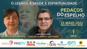 O Legado à saúde e a espiritualidade. Imperdível! Canal Renovando Consciências em parceria com a Associação Médico-Espírita de Sergipe (AME-SE), lançará no dia 23.05.22 (segunda-feira) – 19h30, o programa PEDAÇOS DO ESPELHO, um estudo baseado na obra de Marlene Nobre. Convidado: Gilson Luis Roberto, com a apresentação de Carlos Alberto Santiago. Agende aí! Link: https://www.youtube.com/watch?v=AzCqDp9aG5E