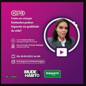 Crenças limitantes Nesta sexta-feira, 20, a Unimed Sergipe promoverá uma live em seu perfil do instagram (@unimedse) para falar sobre um assunto que, ultimamente, tem permeado conversas, principalmente quando se fala em saúde mental: as crenças limitantes. A partir das 16h, a jornalista Priscila Andrade conversará sobre o assunto com a psicóloga, Catarina Barros, que atende no Unimed Pleno e no programa Viver Bem. O bate papo será interativo, com participação do público e promete esclarecer como essas crenças limitantes podem ser prejudiciais ao desenvolvimento do indivíduo.