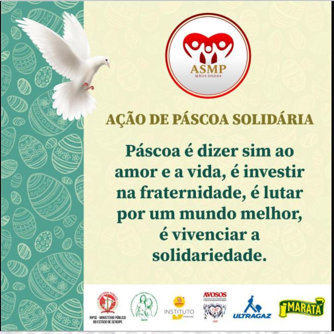 A Associação Sergipana do Ministério Público (ASMP), em parceria com Ministério Público do Estado de Sergipe, Associação dos Voluntários a Serviço da Oncologia em Sergipe (AVOSOS), Instituto GBarbosa, Ultragaz e Maratá, por meio do Projeto Mãos Dadas, promovem a ação PÁSCOA SOLIDÁRIA que pretende enviar doação de recursos, cestas básicas e outros gêneros alimentícios a MATER – Associação de Mulheres do Bairro Santa Maria e Trabalhos em Reciclagem, a qual atende o Projeto Recriarte, bem como prestar auxílio a entidades sociais outras situadas naquela comunidade.