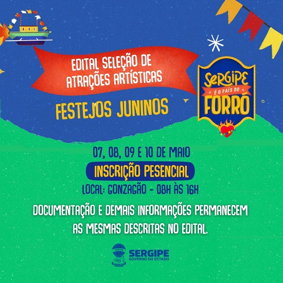 O Governo de Sergipe, por meio da Fundação de Cultura e Arte Aperipê (Funcap), informa uma alteração no processo de inscrição do Edital de chamamento para seleção de atrações artísticas nos festejos juninos de 2024. As inscrições serão realizadas de forma presencial de 7 a 10 de maio, das 8h às 16h, no Complexo Cultural Gonzagão.