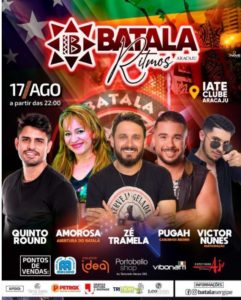Batalá Ritmos dia 17 em Aracaju II Estamos muito felizes em lançar o Batalá Ritmos 1ª Ed, uma festa para mostrar nosso trabalho e unir artistas de vários estilos, e agora ainda mais por essa conexão com a Bahia. Além disso, nossa meta é também arrecadar alimentos não perecíveis para doação ao Lar de Idosos Nossa Senhora da Conceição – Same, e Associação de Pais e Amigos dos Excepcionais – Apae”, destaca a diretora do Batalá Sergipe, Kátia Buarque. Aos valores de R$ 20 (individual pista) e R$ 120 (mesa 4 lugares), os ingressos estão à venda nas lojas Vibonatti, Auto Peças Macedo, Portobello Shop, Espetinho Aju e Colégio Ideal e também através do instagram @batalasergipe.