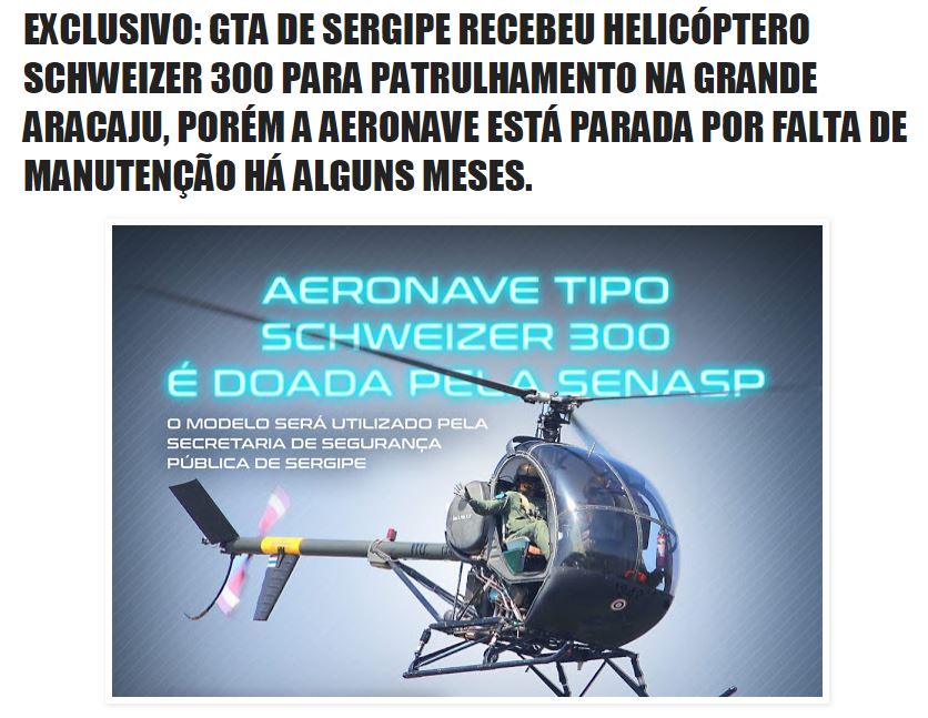 Aguardamos algum esclarecimento por parte do Governo do Estado, informando quando este helicóptero voltará a operar em prol da população sergipana, através da SSP/SE.