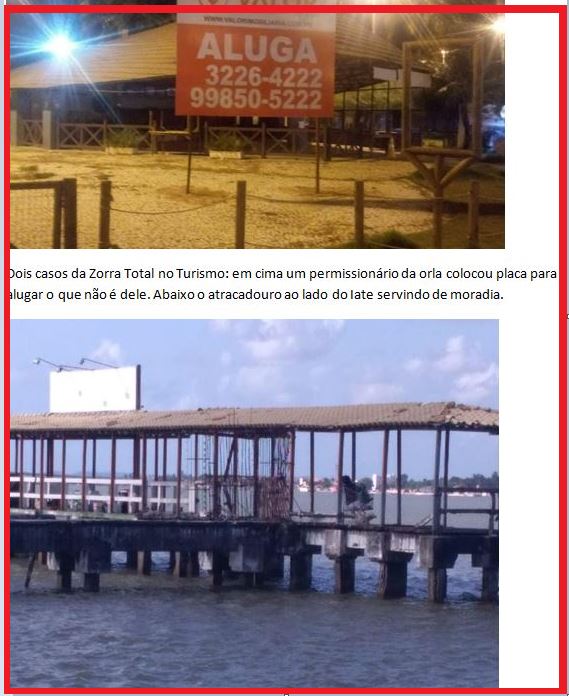 Enquanto isso, um permissionário, da antiga Baviera, colocou uma placa de aluga-se no estabelecimento (diga-se de passagem a imobiliária não tem culpa), como se o local fosse dele. Ali é uma área com contratos permissionários. Se o permissionário não quer mais tem que entregar para que a Emsetur providencie um novo interessado através de licitação. Como alugar o que não é dele? Isso tudo porque o descaso do governo é total na orla.