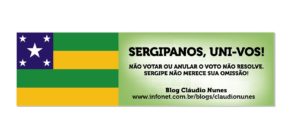 Campanha contra a abstenção, votos nulos e brancos Pelo zap, de Igor Saraiva:“Caro Cláudio fiquei feliz ao ler e receber uma mensagem do meu candidato ao governo Dr. Emerson com a seguinte frase “Se você não votar, quem vende o voto poderá decidir a eleição. E aí você já sabe o que pode acontecer.” Sou um dos leitores que pediu adesivos e distribui aqui na minha cidade. É preciso que não só Dr. Emerson, mas todos candidatos de bem, que não compram votos encampe esta campanha iniciada por você.” Do blog: dos adesivos distribuídos (faltam pouquíssimos) grande parte foi para o interior. Isso já é um avanço. Quem desejar pode pedir pelo zap do Blog (79) 99890 2018 ou pelo e-mail claudionunes@infonet.com.br enviando o endereço e o nome do destinatário que receberá em poucos dias pelos Correios.