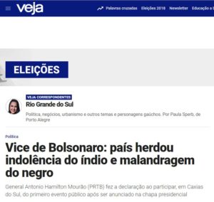 www.twitter.com/palmeriodoria General Hamilton Mourão diz que Brasil herdou a indolência dos indígenas e a malandragem dos africanos. Os africanos o mandaram pra tonga da mironga do kabuletê. Os indígenas, pra tanga da mironga também do kabuletê.