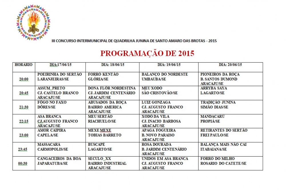 A Associação das Quadrilhas Juninas de Sergipe – ASQUAJU-SE, estará realizando em Santo Amaro o 3º Concurso Intermunicipal de Quadrilhas Juninas. As eliminatórias serão realizadas nos dias 17, 18, 19 e 20 de junho e no dia 21 a grande final. Ao lado a relação das quadrilhas com os dias e horários das apresentações.