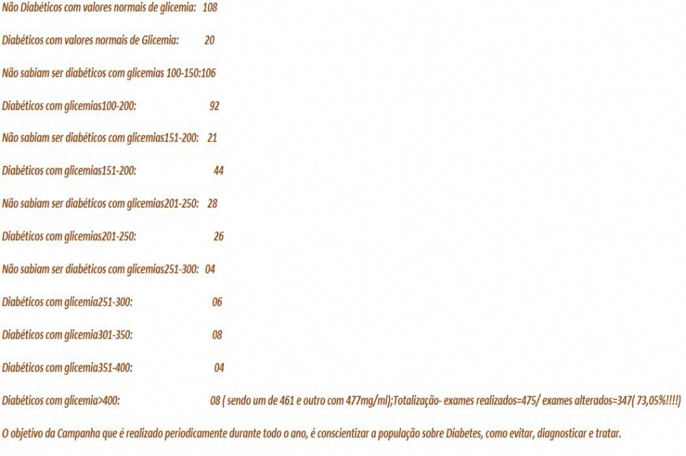 Foram utilizados na detecção monitores accu-chek do laboratório Roche,a grande importância desse trabalho é que os indivíduos que apresentaram exames alterados na dosagem de sangue capilar foram encaminhados para unidades de Saúde da Secretaria Municipal de Itabaiana,ou para os Serviços de Diabetes da Cidade de Aracaju,ou então para o Centro de Especialidades Médicas de Aracaju ( CEMAR ),na finalização do Mutirão foram encontrados os seguintes resultados no quadro ao lado.