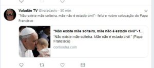 www.twitter.com/valadaotv “Não existe mãe solteira, mãe não é estado civil”- feliz e nobre colocação do Papa