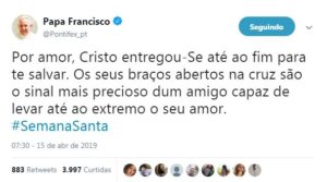 www.twitter.com/Pontifex_pt Por amor, Cristo entregou-Se até ao fim para te salvar. Os seus braços abertos na cruz são o sinal mais precioso dum amigo capaz de levar até ao extremo o seu amor. #SemanaSanta