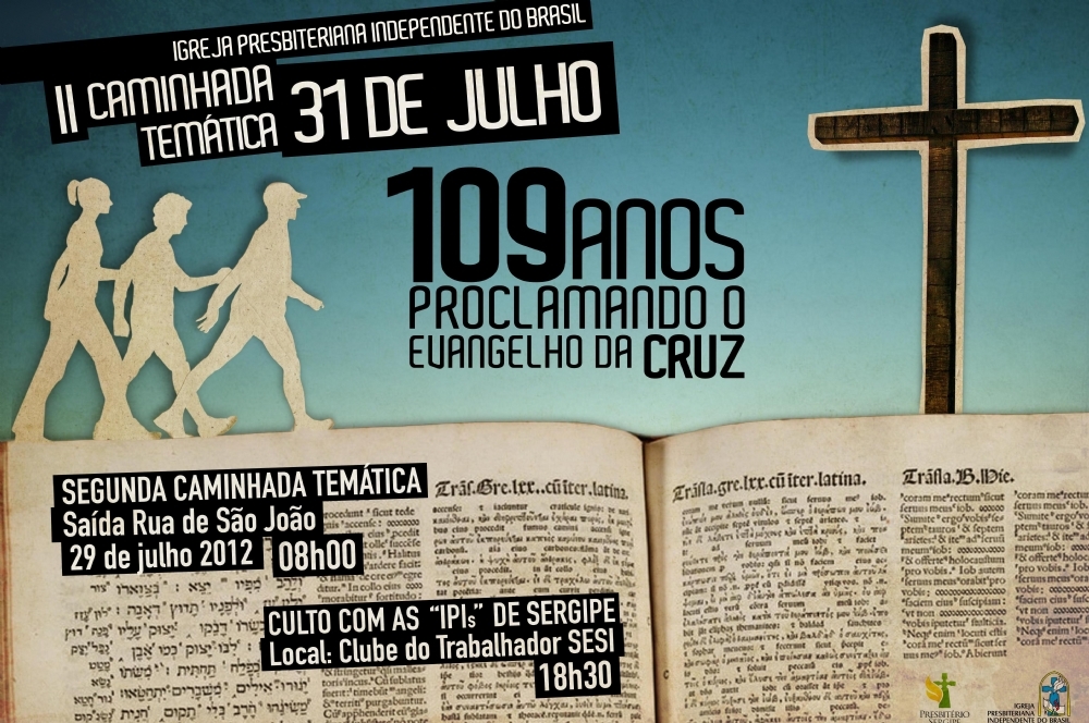 No domingo, 29/7, às 8h da manhã, acontece a segunda caminhada temática da Igreja Presbiteriana Independente, com tema “109 anos proclamando o evangelho da cruz”. Durante todo o trajeto será realizada panfletagem acerca dos temas discutidos durante a semana. A saída está programada para as 8h da manhã, da Rua de São João, no Bairro Santo Antônio, em Aracaju. “Esta é mais uma oportunidade que a nossa IPI tem para mostrar a sua cara para a sociedade sergipana e dizer que nestes 109 anos continuamos firmes no propósito de levar à frente o Evangelho de Jesus Cristo”, afirmou o presbítero Marcos Sales.