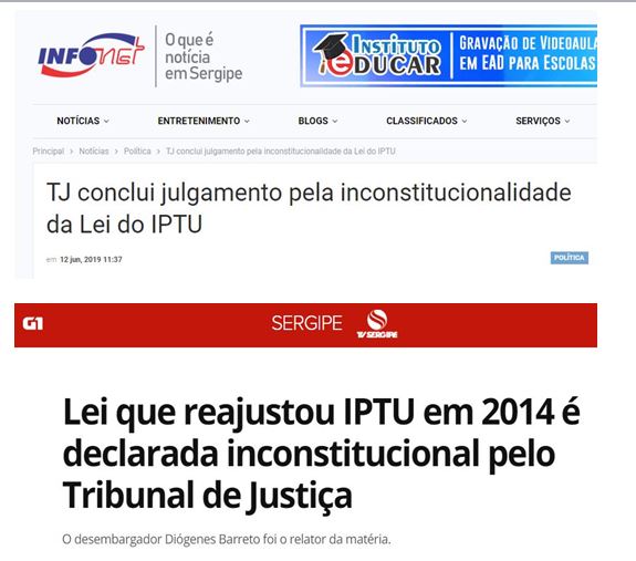 TJ conclui julgamento pela inconstitucionalidade da Lei do IPTU Infonet: Finalmente, o Tribunal de Justiça de Sergipe concluiu o julgamento para declarar inconstitucional a Lei 145/2014, que alterou a base de cálculo para a cobrança do Imposto Predial e Territorial Urbano (IPTU) cobrado pela Prefeitura de Aracaju. A lei foi proposta pelo ex-prefeito João Alves Filho e entrou em vigor no ano de 2015, que promoveu reajuste anual no patamar de 30% até o ano de 2022. Em março do ano passado, o TJ se manifestou em decisão de mérito pela inconstitucionalidade da lei, mas as partes ingressaram com recursos questionando os seus efeitos. Toda matéria aqui.