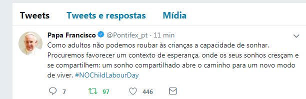 www.twitter.com/Pontifex_pt (Papa Francisco) Como adultos não podemos roubar às crianças a capacidade de sonhar. Procuremos favorecer um contexto de esperança, onde os seus sonhos cresçam e se compartilhem: um sonho compartilhado abre o caminho para um novo modo de viver. #NOChildLabourDay