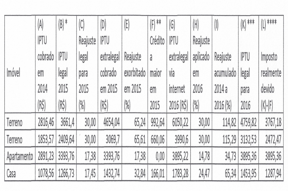 Quem manuseia os referidos carnês, porém, observa que os aumentos acontecidos em 2014, cerca de 65%, permanecem não só vigentes ainda, como majorados no referido limite de 30%, perfazendo um acúmulo de 115% de 2014 a 2016.