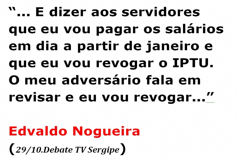“…Já assumi o compromisso e farei: vou revogar o aumento de 30% do IPTU de Aracaju. Criaremos uma comissão para estudar a forma de fazer isto”. Edvaldo Nogueira, ontem em George Magalhães, 103 FM.