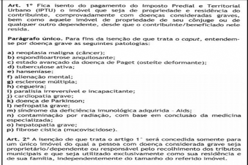 A lei cita as seguintes doenças: neoplastia maligna, tuberculose ativa, hanseníase, doença de Paget, esclerose múltipla, cegueira, doença de Parkson, fibrose cística, alienação mental e outras. O Diário onde a lei foi publicada: /wp-infonet/img/colunistas/194353/3775.pdf