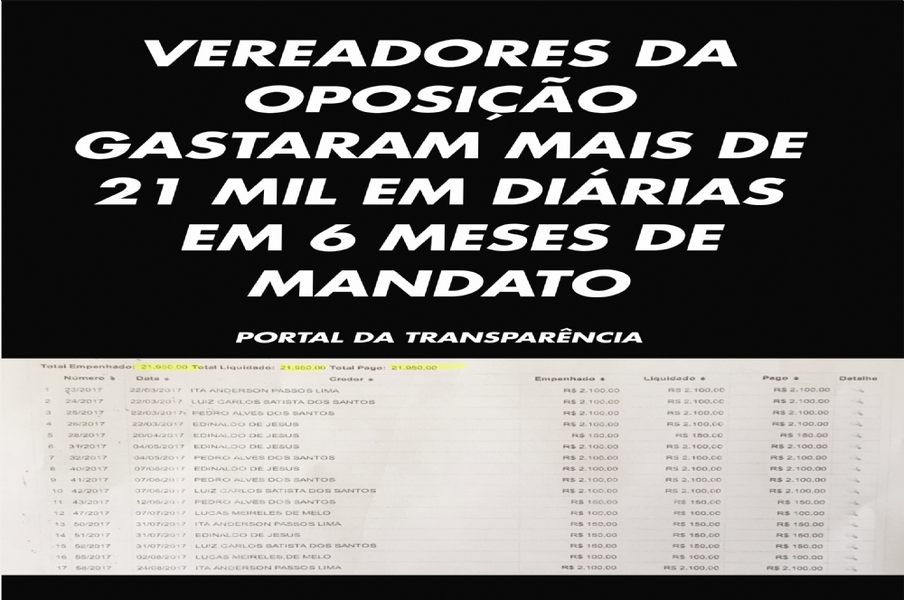 público. Em Macambira, o assunto tem repercutido nos últimos dias causando espanto da população com os gastos considerados altíssimos pelos vereadores da oposição da Câmara Municipal.Conforme dados publicados no Portal da Transparência, a Câmara Municipal de Macambira gastou nos primeiros meses do ano (março a agosto), R$ 21.750,00 (vinte e um mil e setecentos e cinquenta reais) em diárias.”