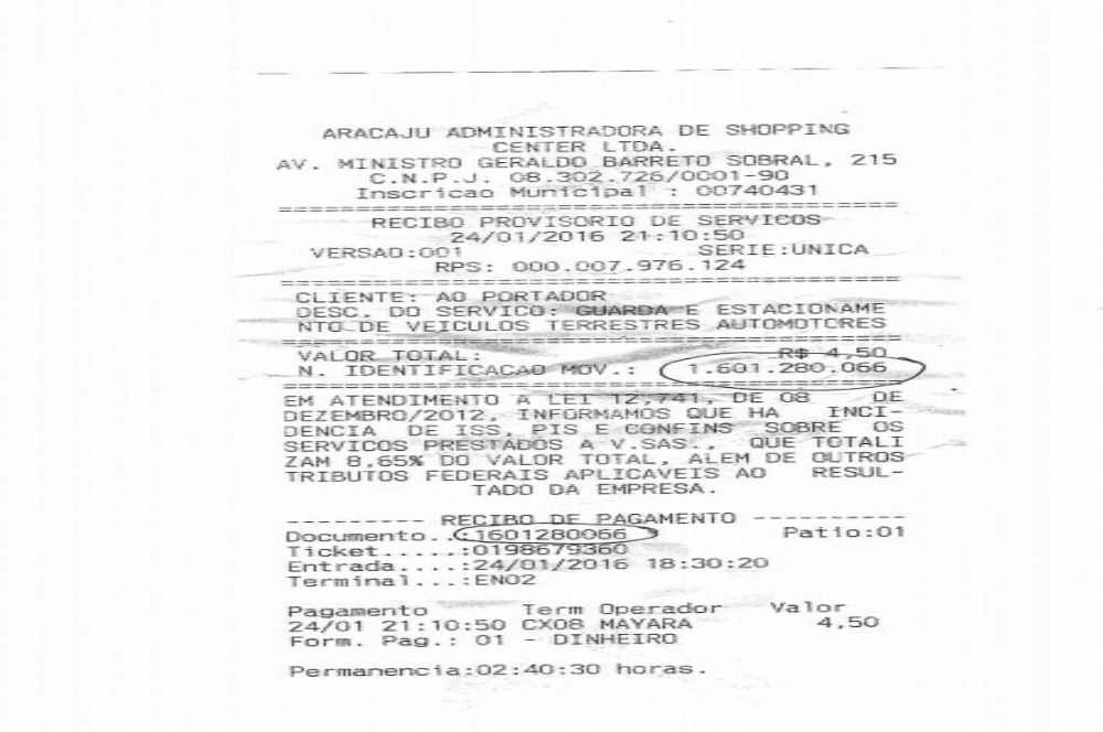 Além da empresa “Master Park”, o Shopping Jardins emite, apenas, “Recibo de Pagamento” dos serviços de estacionamento, chegando a registrar que: “há incidência de ISS, PIS e COFINS no total de 8,65%” sobre o valor pago pelos usuários daquele Shopping. Embora informe haver incidência do ISS, cabe à prefeitura de Aracaju demonstrar quanto arrecadou de ISS incidente sobre os serviços de estacionamento prestados pelas empresas: “Master Park” e Shopping Jardins, em 2015, para que o leitor possa entender se há, ou não, sonegação fiscal.