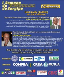 Prossegue até amanhã, 06, a I Semana de Engenharia de Sergipe. Inscrições por dia E prossegue no Hotel Quality em Aracaju, das 13h30 às 18h30 a I Semana de Engenharia de Sergipe numa parceria entre diversas entidades de classe de Sergipe e empresas privadas. Para hoje 05 e amanhã, 06, quem tiver interesse em algum tema distinto pode fazer a inscrição apenas para um dia.